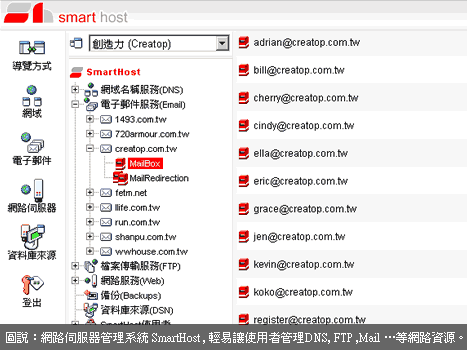 創造力 Creatop 投入大量的人力與時間,開發重量級的網路虛擬主機的管理系統,SmartHost 讓一般企業具備可以輕易管理網站伺器的一切成功條件。